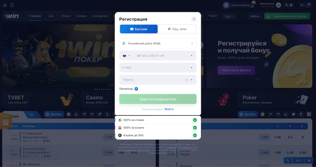 Создание аккаунта в букмекерской конторе 1вин занимает минимум времени. Для того чтобы зарегистрироваться необходимо нажать на соответствующую кнопку на главной странице сайта и заполнить форму с данными: